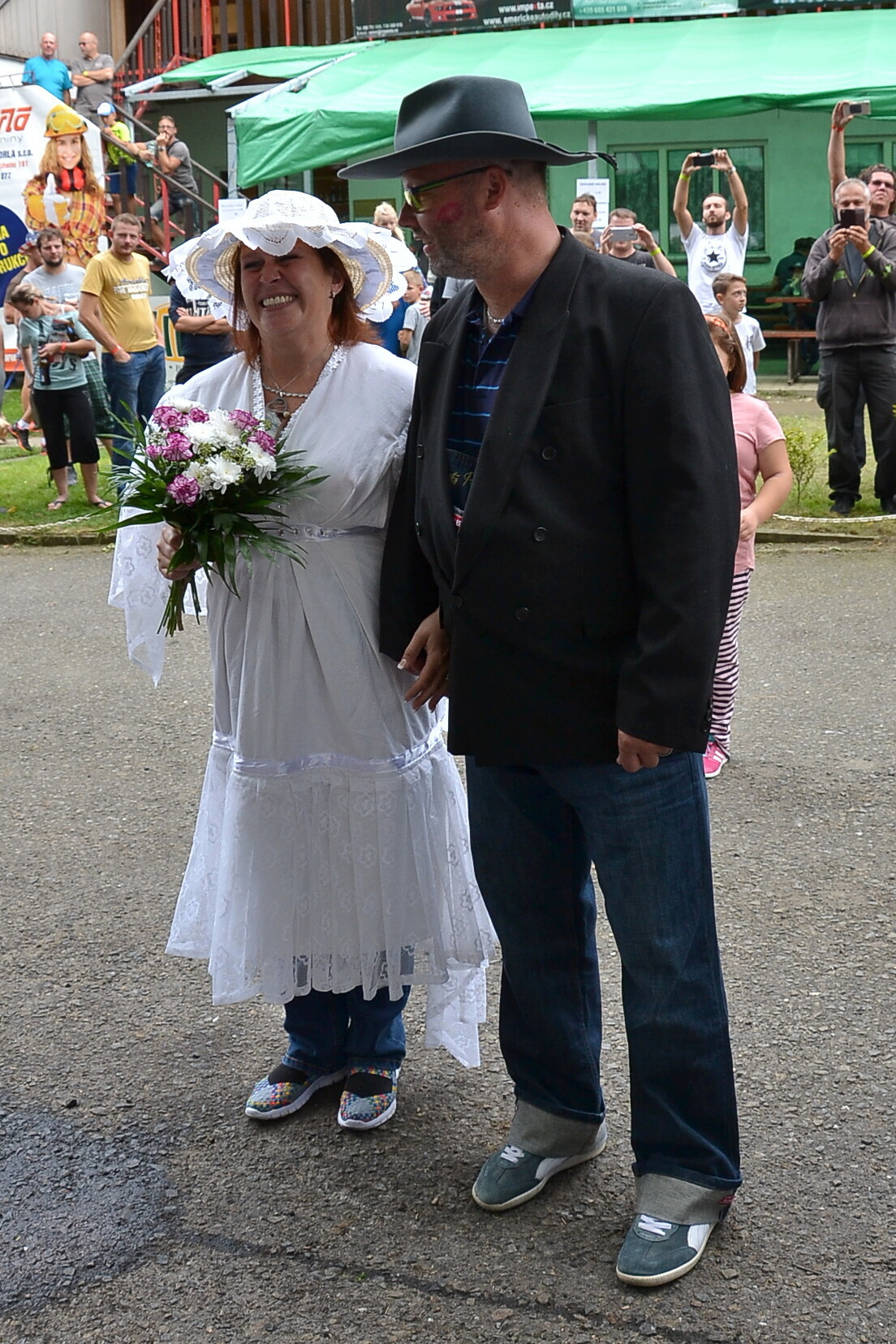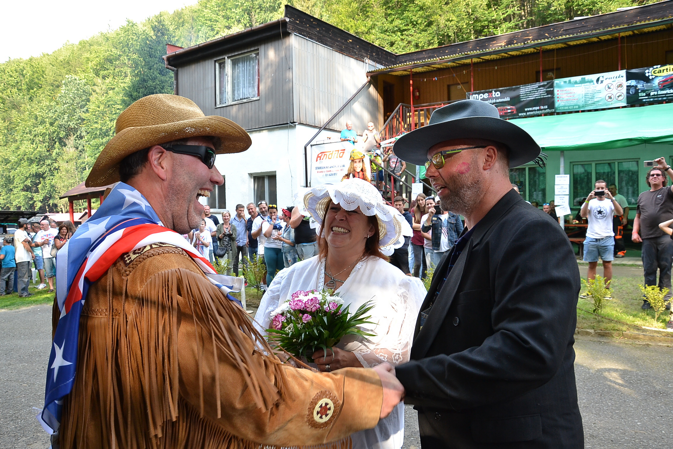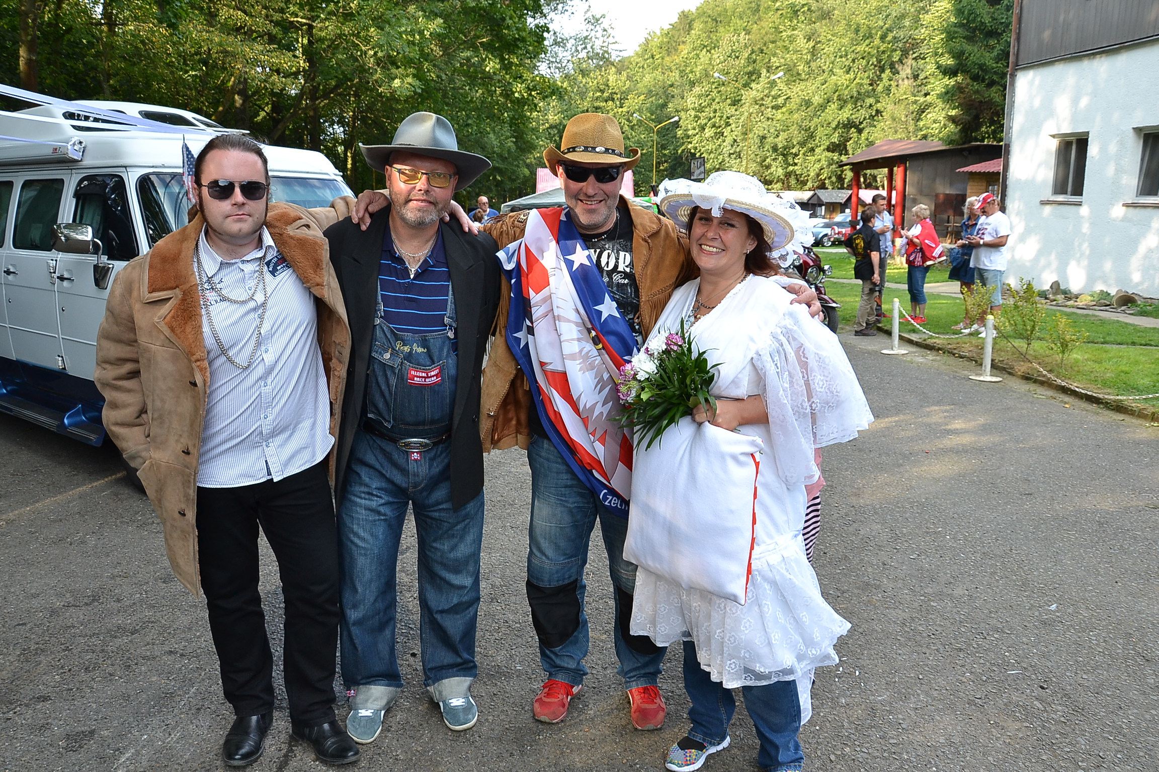 Sobotní dopoledne najíždí další a další ameriky a pokračujeme v debatách o všem možném, co jsme nestihli probrat včera. Po obědě se řadíme na spanilou jízdu a za perfektní asistence policie míříme do Tošovic. Tamní HeiPark nás hostí už několikátým rokem a každý si zde přijde na své, ať už se kochá auty, nebo využije jednu z atrakcí. Po příjezdu z HeiParku nastává čas na prezentaci Vlastíka Němce alias Strýčka Sama, který každou chvíli vymyslí nějaký projekt, který drží až do poslední chvíle v nejpřísnějším utajení. Pamatujete na jeho Velo-Ford-Rex, Velo-Ford-Trifid nebo aktuální Americký Cirkus Strýčka Sama? Nyní má v rámci Cirkusu vymyšlenou koloběžku v americko-evropské verzi. Netuší ale, že se tentokrát karta obrátí, jeho prezentace bude hned na začátku přerušena a celé dění nabere úplně jiný směr. Vlastíkův syn Robert a kamarádka Renata si v pátek v poledne v Mladé Boleslavi řekli své „ano“ a na sobotu si pro nás přichystali druhou svatbu. Jen co se vracíme z vyjížďky, začínáme nepozorovaně realizovat předem dlouho připravovanou akci. Oblékáme novomanžele a sebe do kostýmů a když je všechno připravené, zve Dušan Vlastíka k pódiu, aby nám ukázal svůj nový výtvor. Do toho ale přijíždí novomanželé v otevřeném Buicku a přicházíme my, svědkové. Do teď nic netušící Vlastík sleduje parádní obřad. Dušan oddává novomanžele, kterým jdou za svědky mimozemšťan, cikánská vědma, vymítačka duchů, mafián z Bronxu, nebo kavárenský elegán z přelomu 19. a 20. století. Poté, co jsou pod nátlakem donuceni slíbit si věrnost, přichází policie a zatýká novomanžela, coby sňatkového podvodníka.